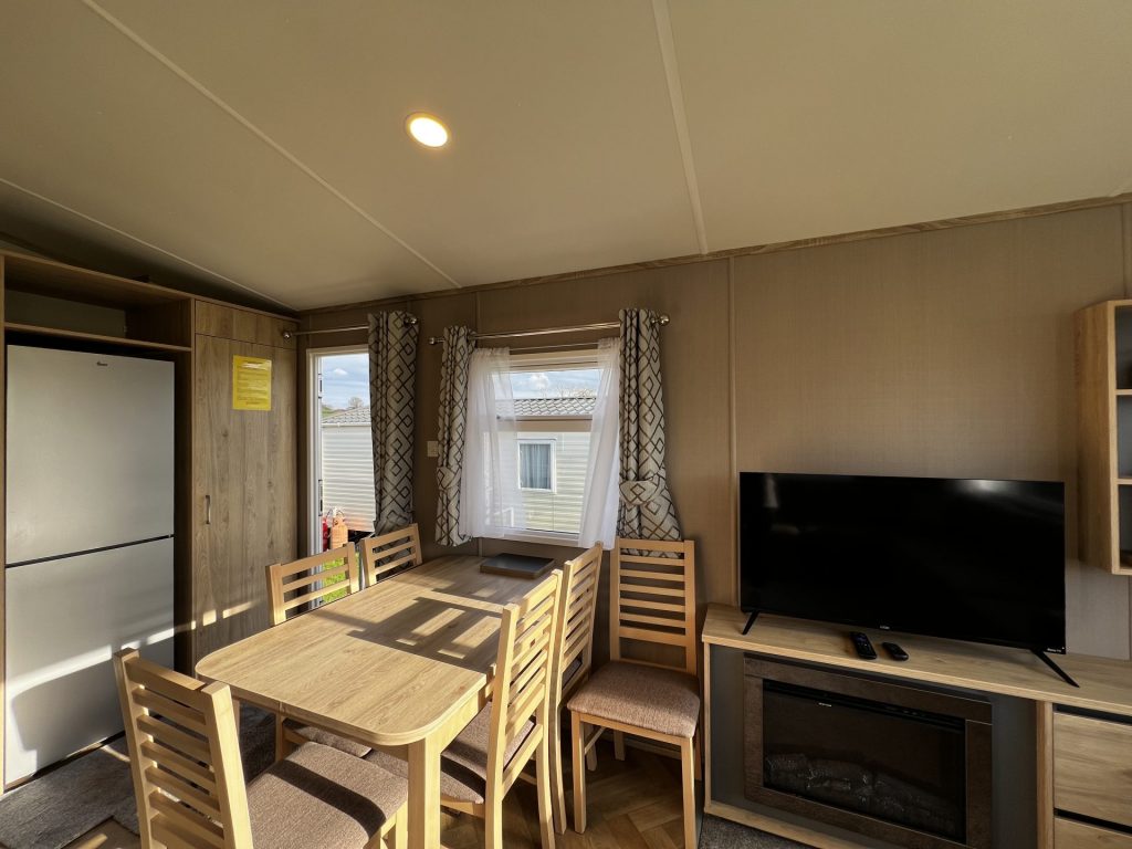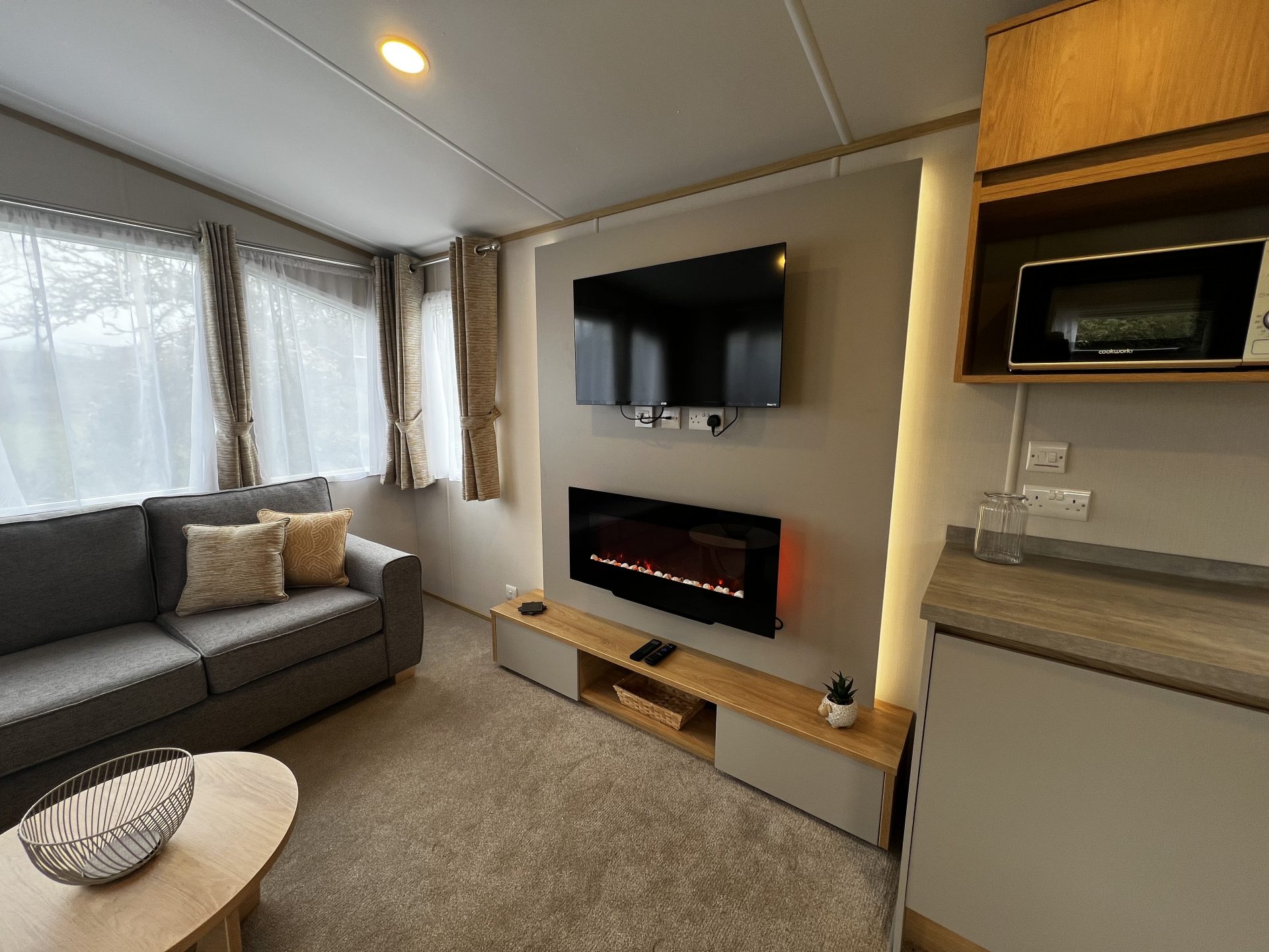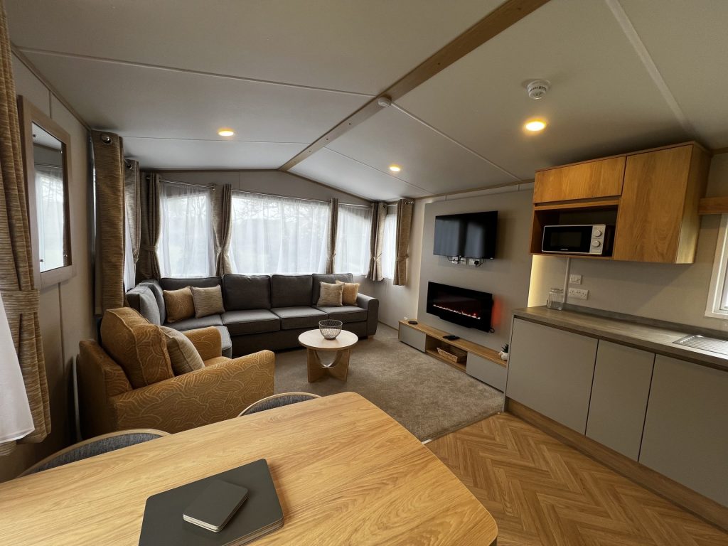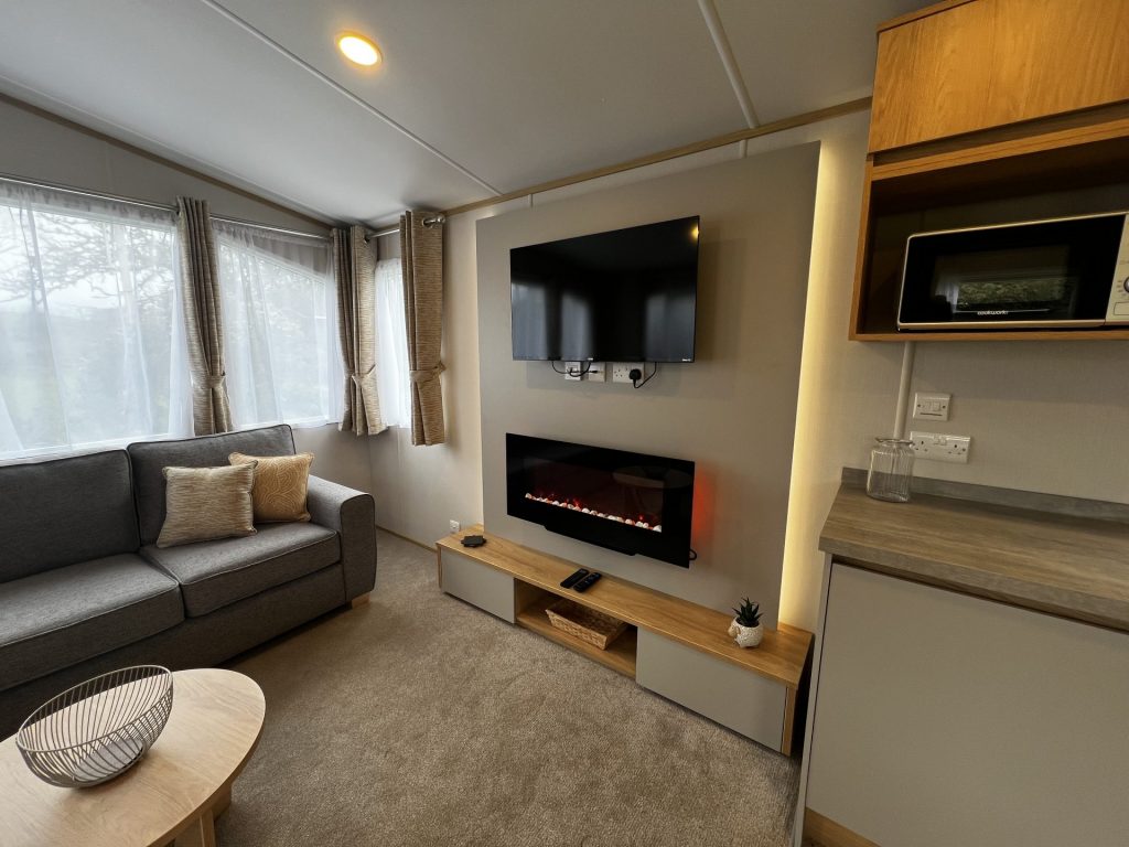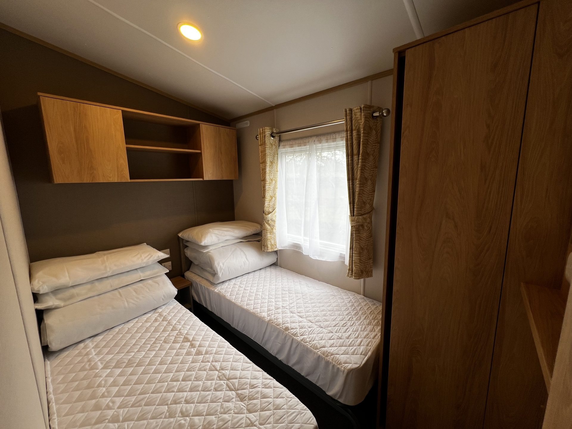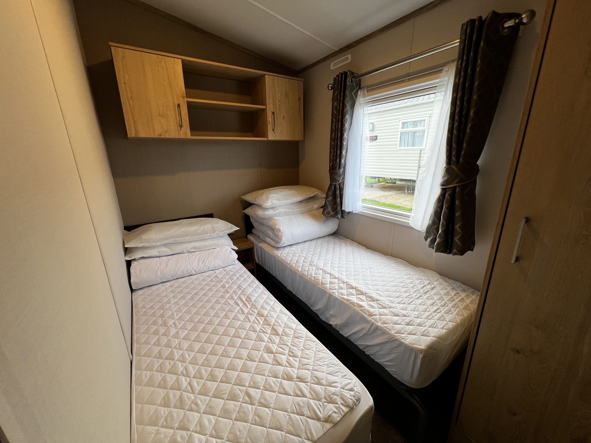 This luxury caravan is available as pet free if booked in advance. One bedroom with central king size bed with lift up under bed storage and one bedroom with two single duo beds. Shower room with toilet, washbasin and shower. Kitchen with gas cooker, microwave and 70/30 fridge/freezer. Lounge with 32″ TV, electric fire. Double pull-out bed in lounge. Heating in all rooms and double glazed.