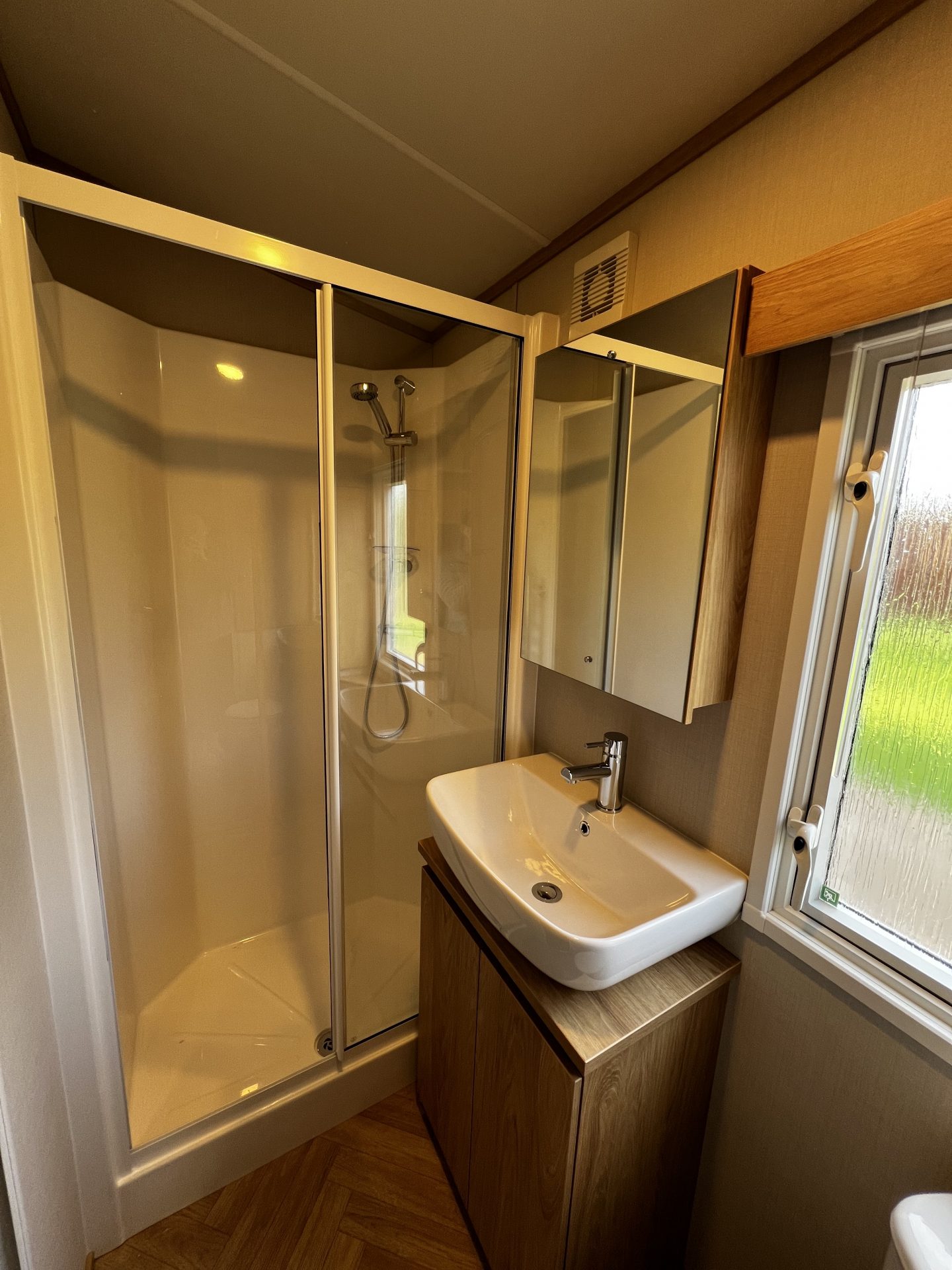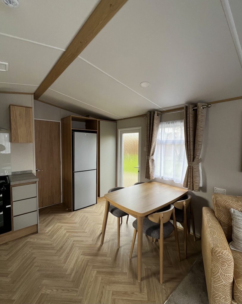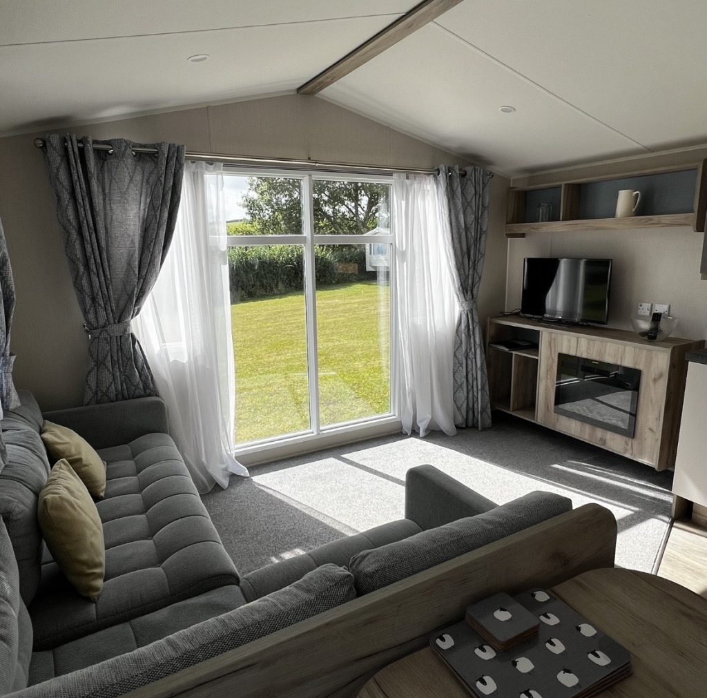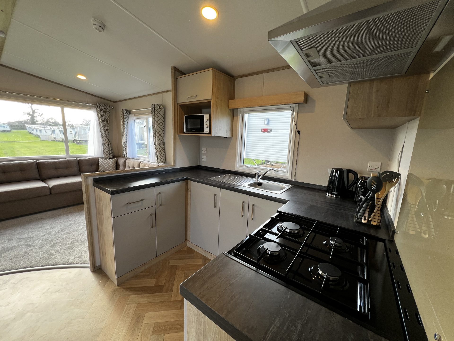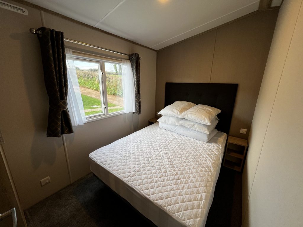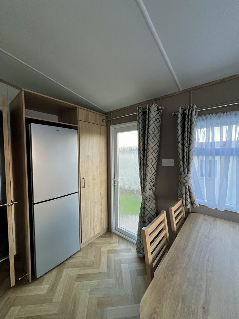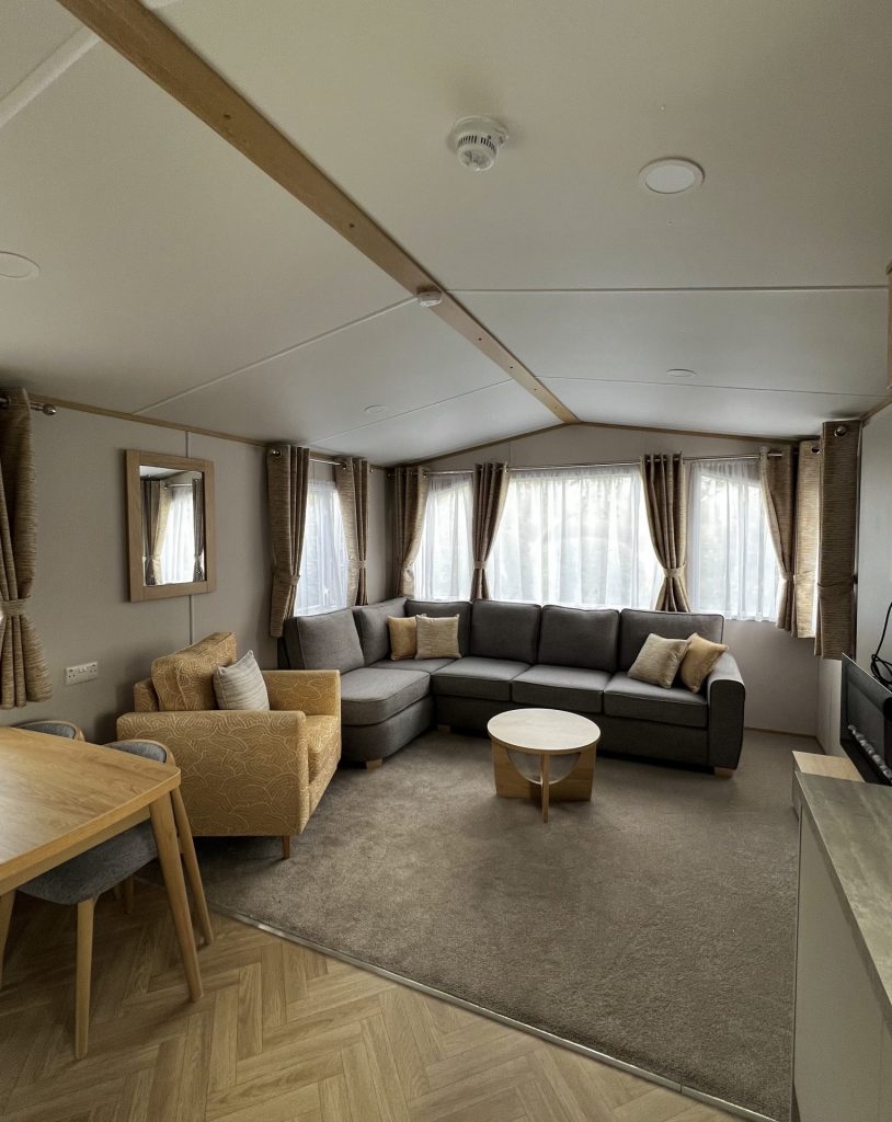 This luxury caravan is available as pet free if booked in advance. One bedroom with central king size bed with lift up under bed storage and one bedroom with two single duo beds. Shower room with toilet, washbasin and shower. Kitchen with gas cooker, microwave and 70/30 fridge/freezer. Lounge with 32″ TV, electric fire. Double pull-out bed in lounge. Heating in all rooms and double glazed.