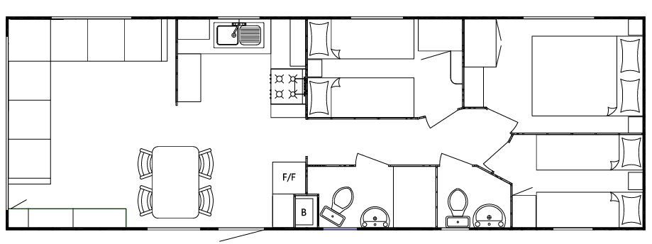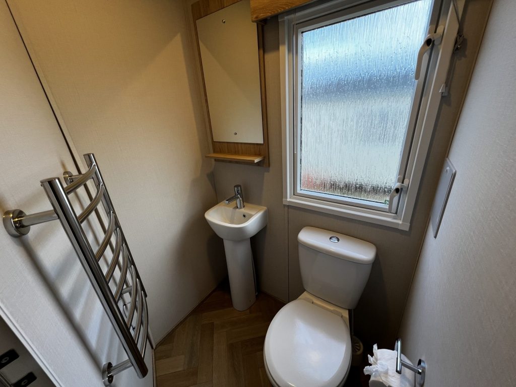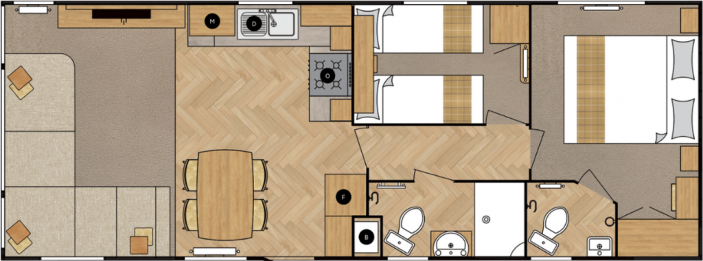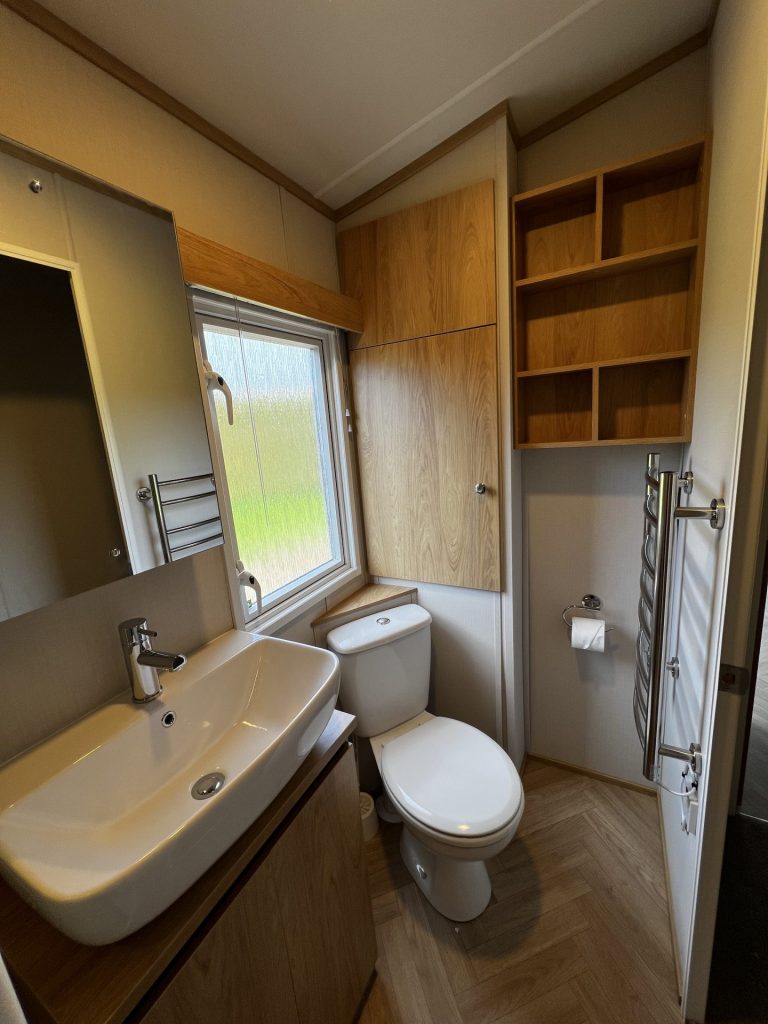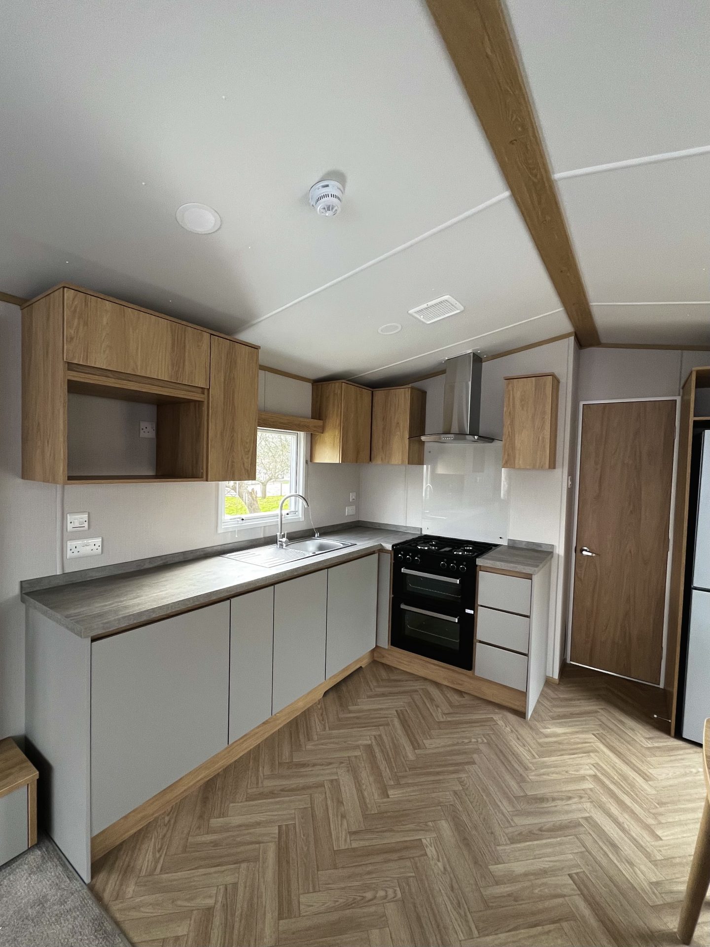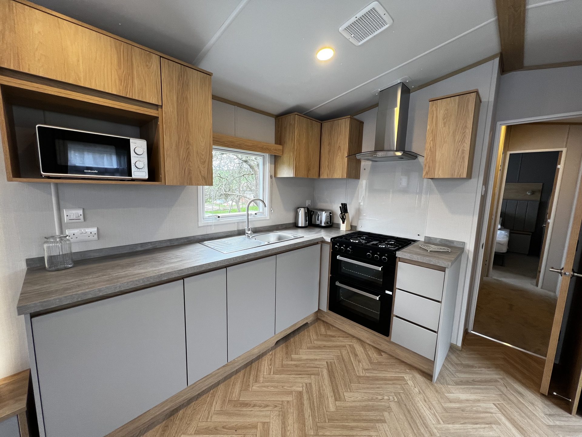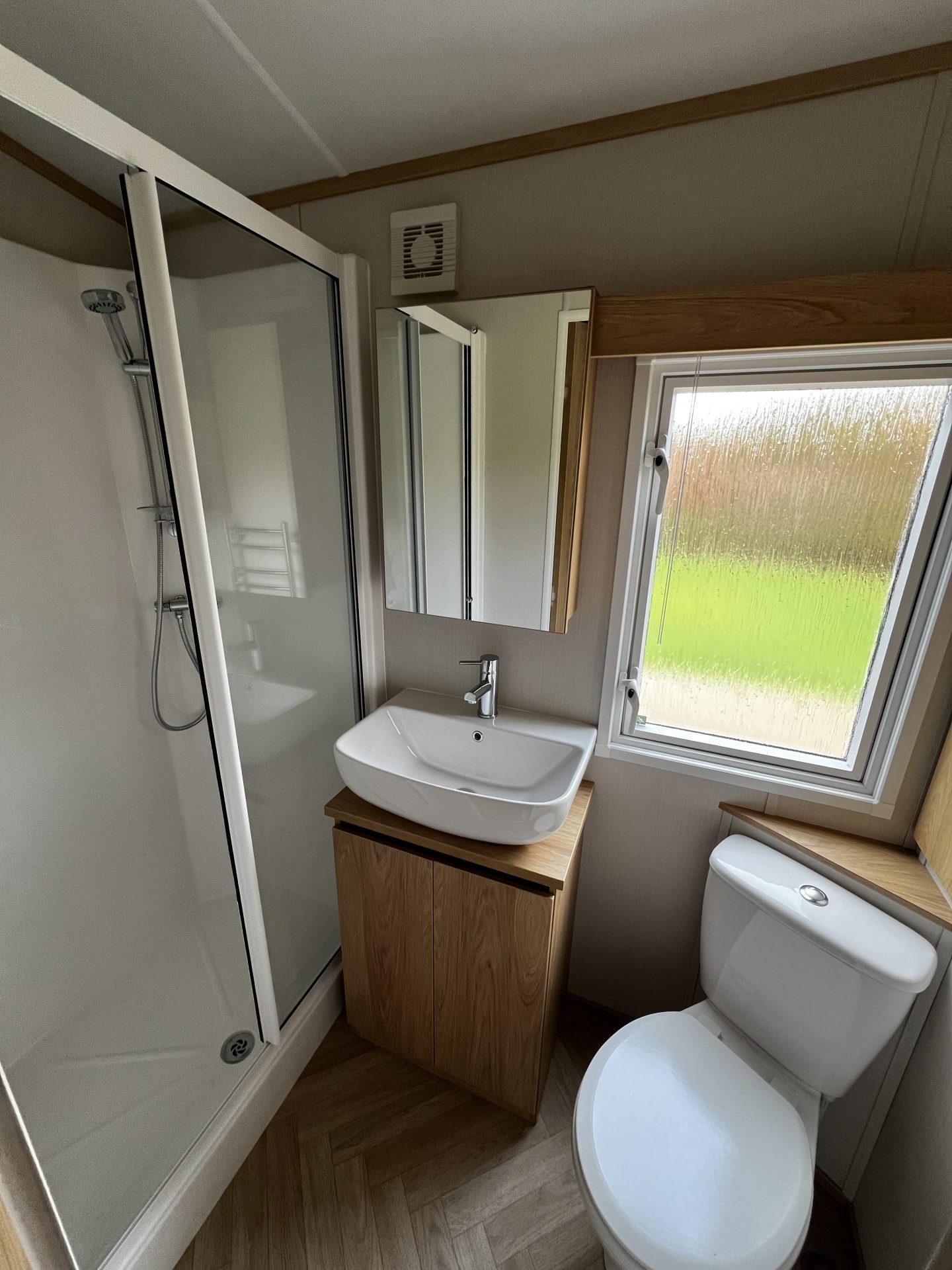 This luxury caravan is available as pet free if booked in advance. One bedroom with central king size bed with lift up under bed storage and one bedroom with two single duo beds. Shower room with toilet, washbasin and shower. Kitchen with gas cooker, microwave and 70/30 fridge/freezer. Lounge with 32″ TV, electric fire. Double pull-out bed in lounge. Heating in all rooms and double glazed.