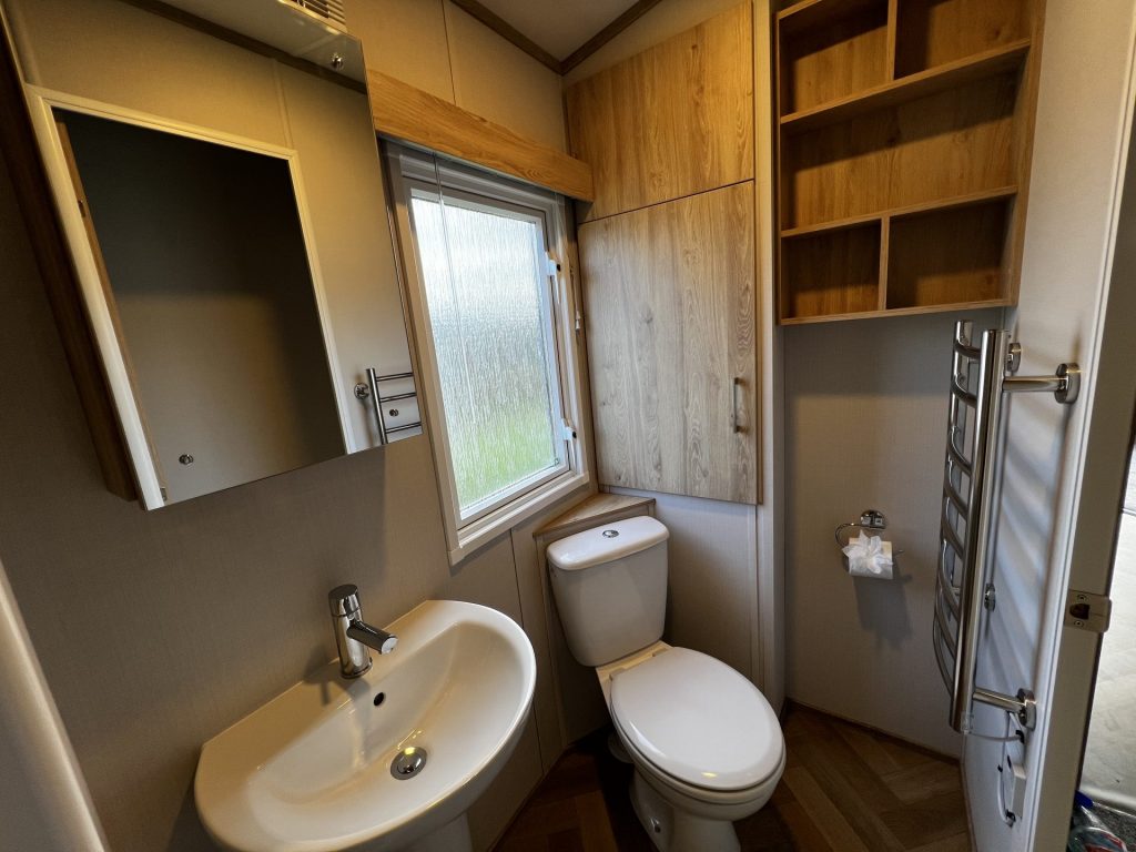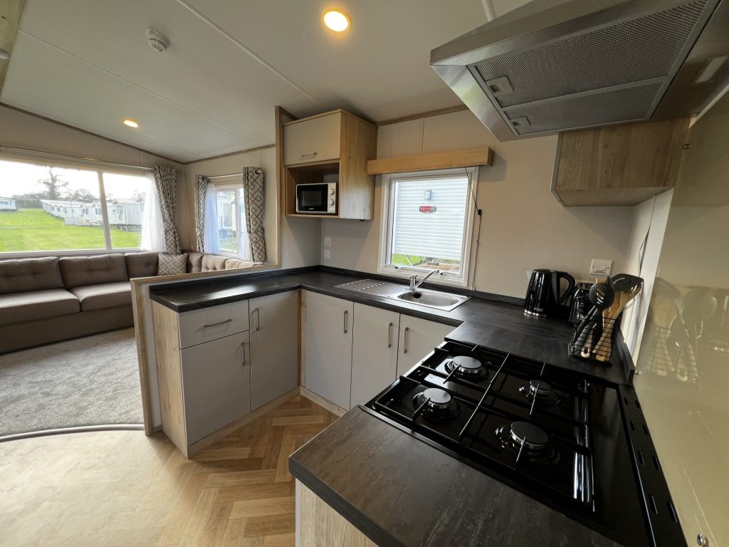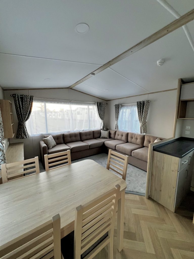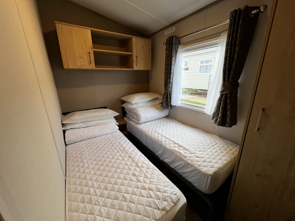 This caravan is available as pet free if booked in advance. Gas and electric. One bedroom with central double bed, lift up under bed storage and another bedroom with twin duo beds. Shower room with shower, toilet, washbasin and heated towel rail. Kitchen with gas cooker, fitted microwave, toaster and fitted 70/30 fridge-freezer. Lounge with 32″ TV, electric fire and double pull-out bed. Heating in all rooms and double glazed throughout.