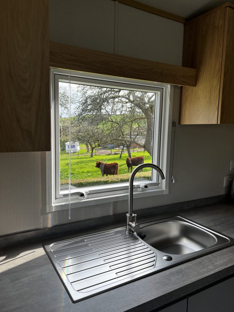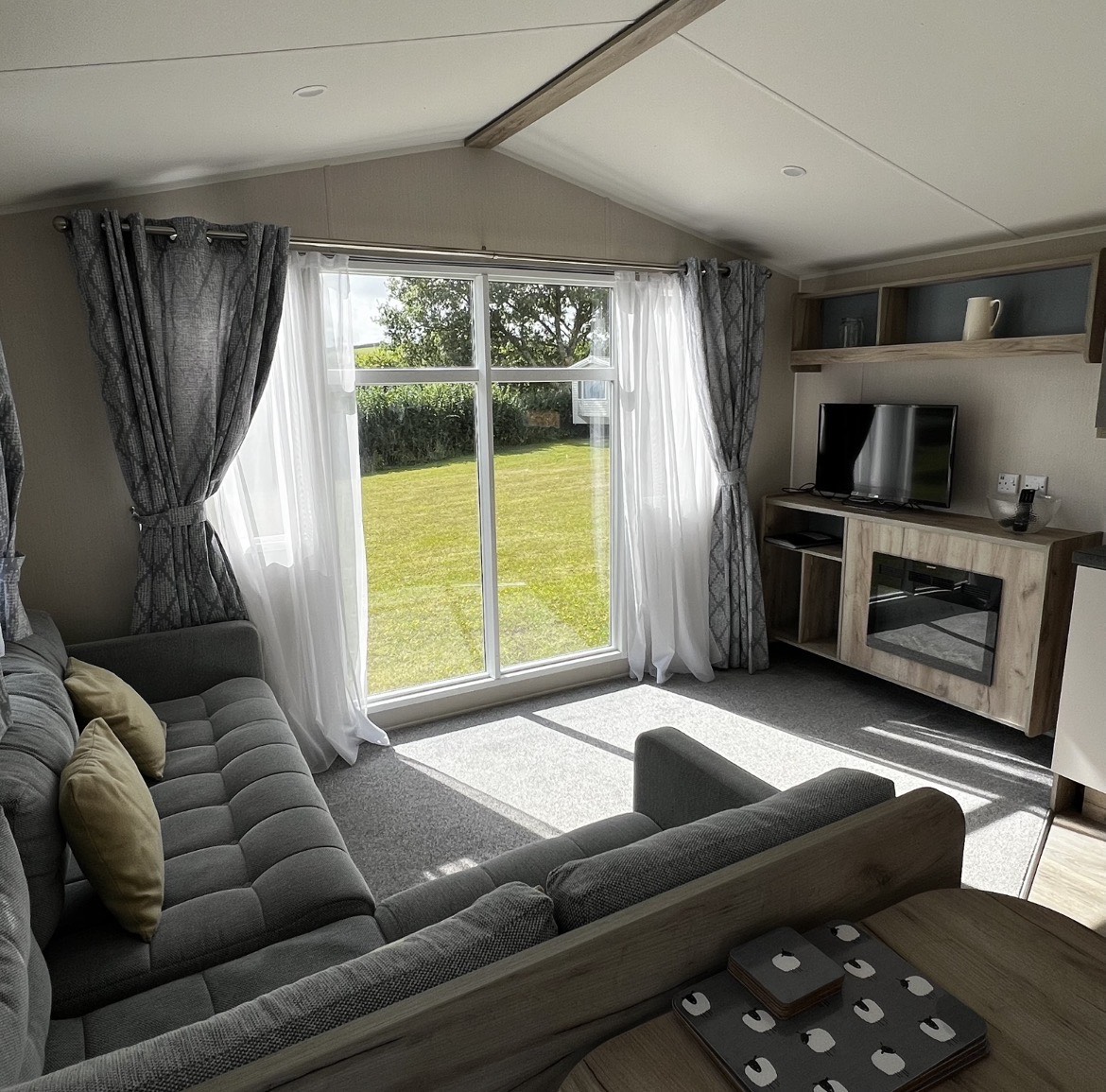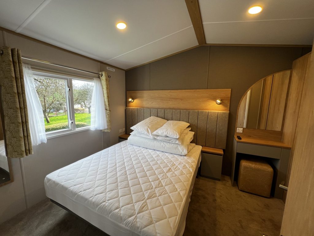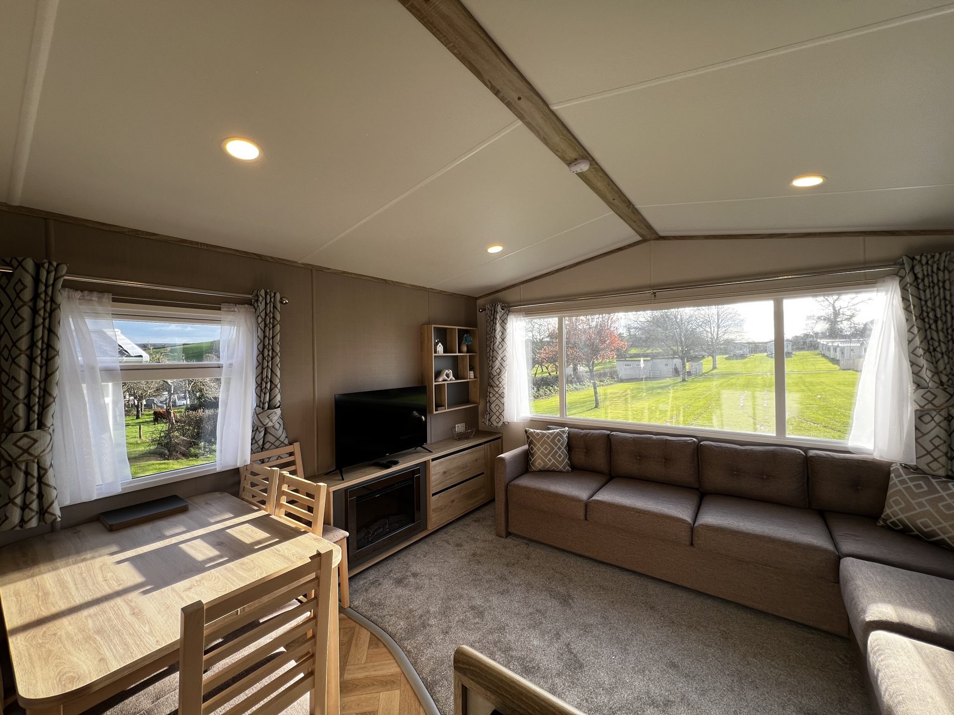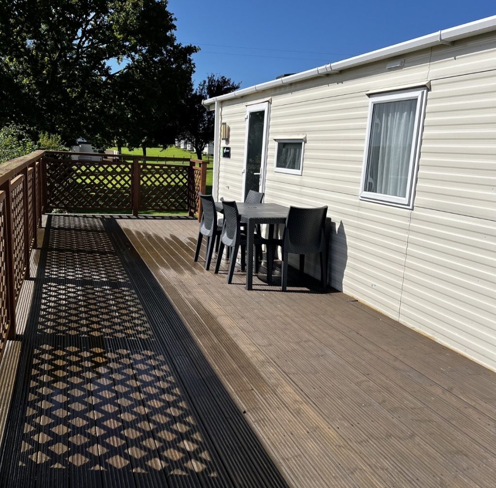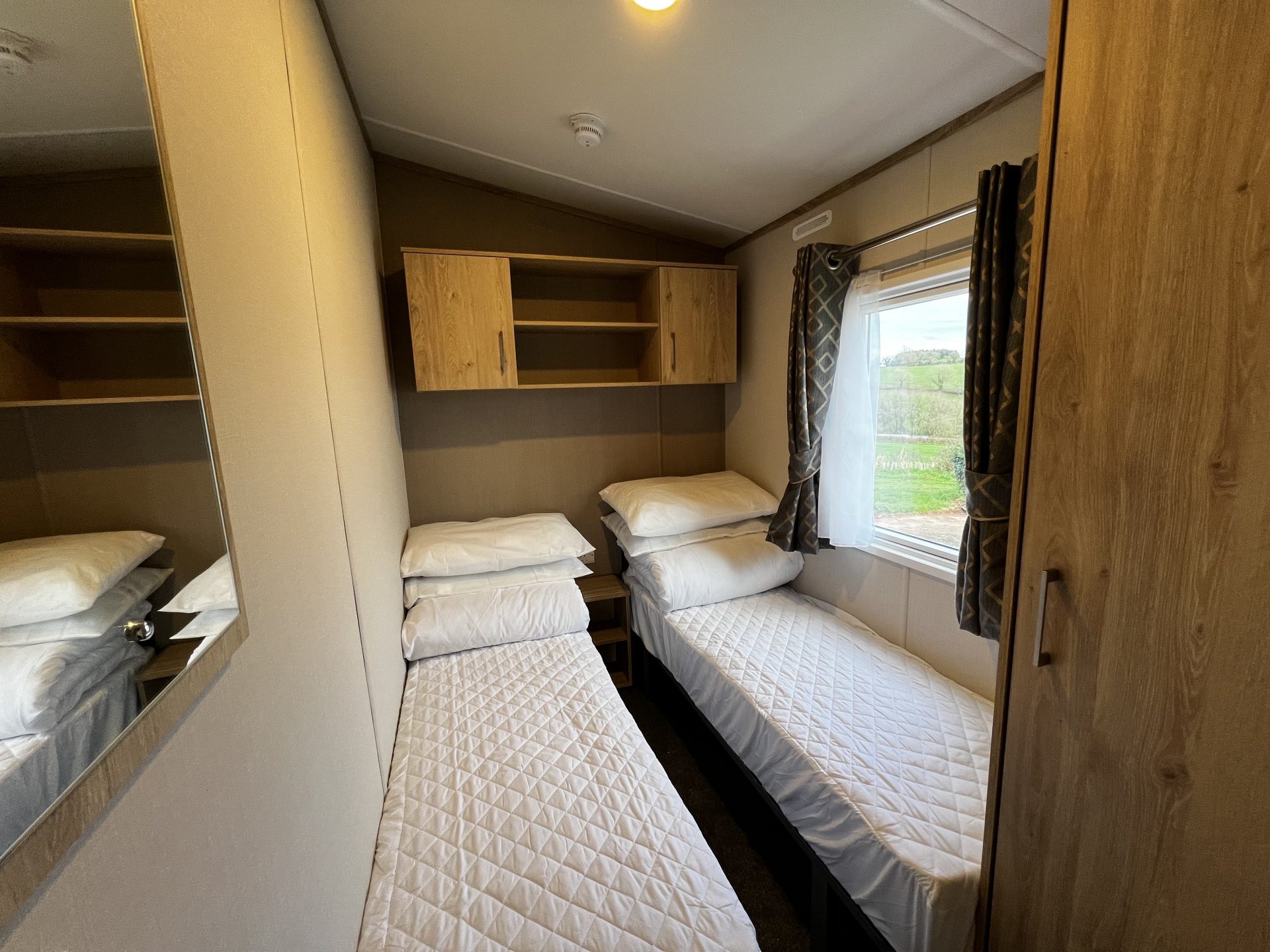 One bedroom with central king size bed with lift up under bed storage and one bedroom with two single duo beds. Shower room with toilet, washbasin and shower. Kitchen with gas cooker, microwave and 70/30 fridge/freezer. Lounge with 32″ TV, electric fire. Heating in all rooms, double glazed. A spacious, gated and private decking along length of caravan with views of the orchard, furnished with dining table and chairs.